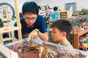 七年級生王秉誠愛螞蟻成痴,今年六月,他在桃園開設全國第一間實體店面「螞蟻帝國」,小朋友貼近觀察螞蟻的行為,才知道出巢覓食、偵查等危險工作都是年紀大的螞蟻在做,顛覆大家對螞蟻的想像。